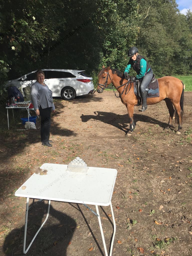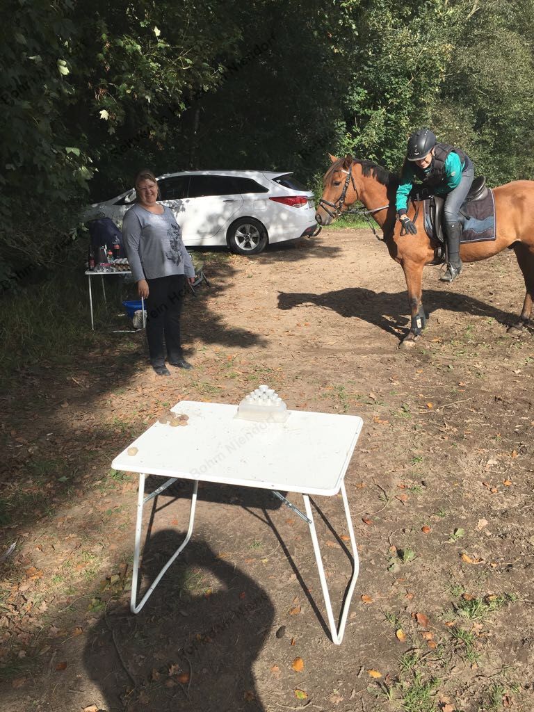Hier galt es, vom Pferd aus (für Radler aus dem Stand) mit Kastanien eine Büchsen-Pyramide umzuwerfen.